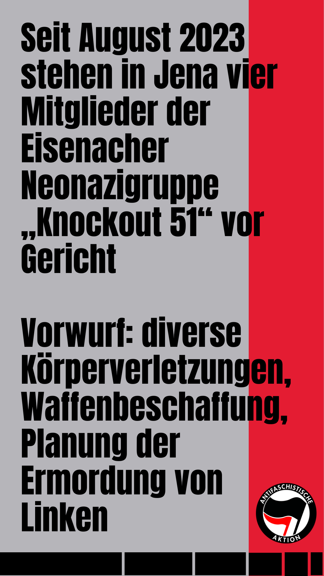 Seit August 2023 stehen in Jena vier Mitglieder der Eisenacher Neonazigruppe „Knockout 51“ vor Gericht: ihnen wird vorgeworfen, diverse Körperverletzungen begangen, Waffen zusammengetragen, Schießtrainings durchgeführt und in letzter Konsequenz geplant zu haben, Linke zu ermorden.