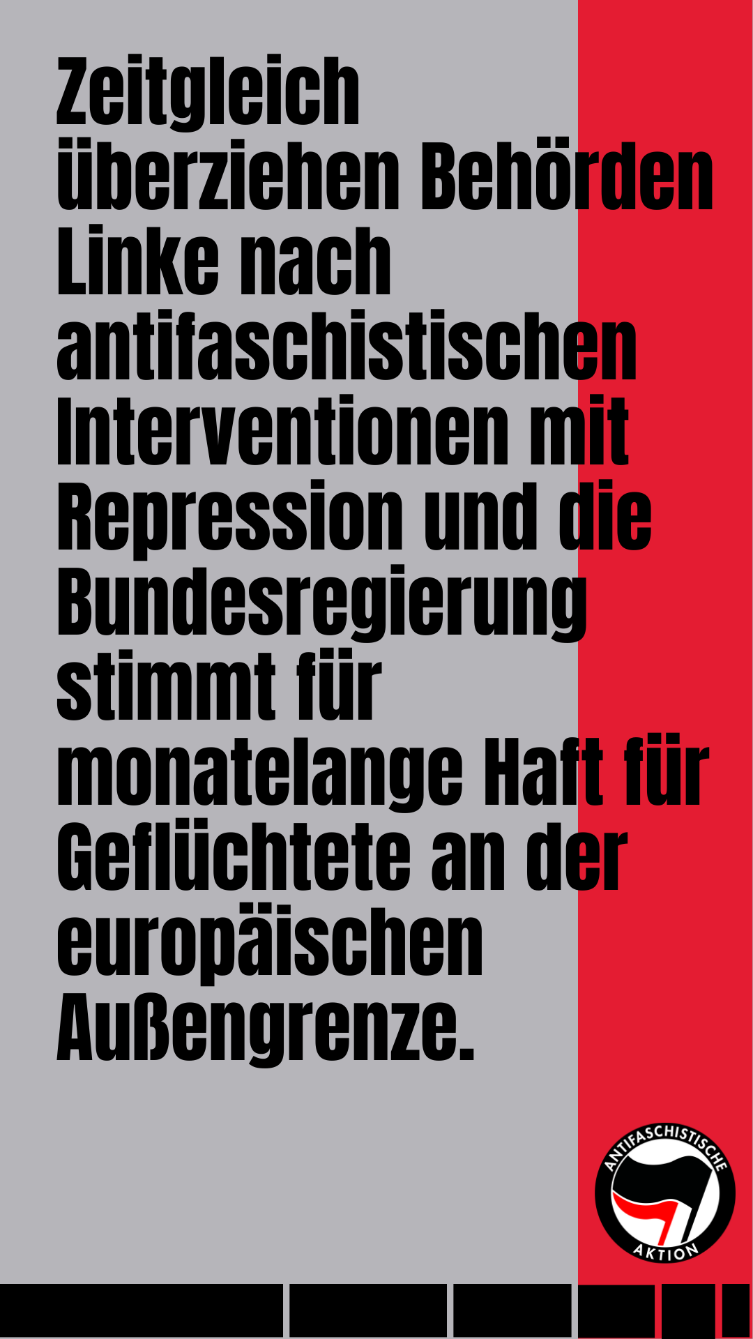 All das zeigt uns einmal mehr, dass staatliches Handeln im Zweifel eher auf die Aufrechterhaltung neoliberalen Normalvollzugs setzt, als im Kampf gegen Nazis eine ernstzunehmende Option zu sein. Im Gegenteil: Während wir damit beschäftigt sind, die Landnahme der Nazis abzuwehren, stimmt die Bundesregierung mit dem sogenannten „Asylkompromiss“ (2.0) für monatelange Haft in Lagern an den EU-Außengrenzen und führt Bezahlkarten für Menschen ein, die in der BRD Asyl beantragt haben. Migranitisierte und geflüchtete Menschen werden nach ihrer Nützlichkeit für den Standort Deutschland bewertet und verwaltet. Nazis morden, der Staat schiebt ab, das Mittelmeer ist auch aufgrund der deutschen Politik seit Jahren ein Massengrab, und auch wer sich mit demokratischen Mitteln gegen diese Zustände wendet, wird kriminalisiert und eingeschüchtert.