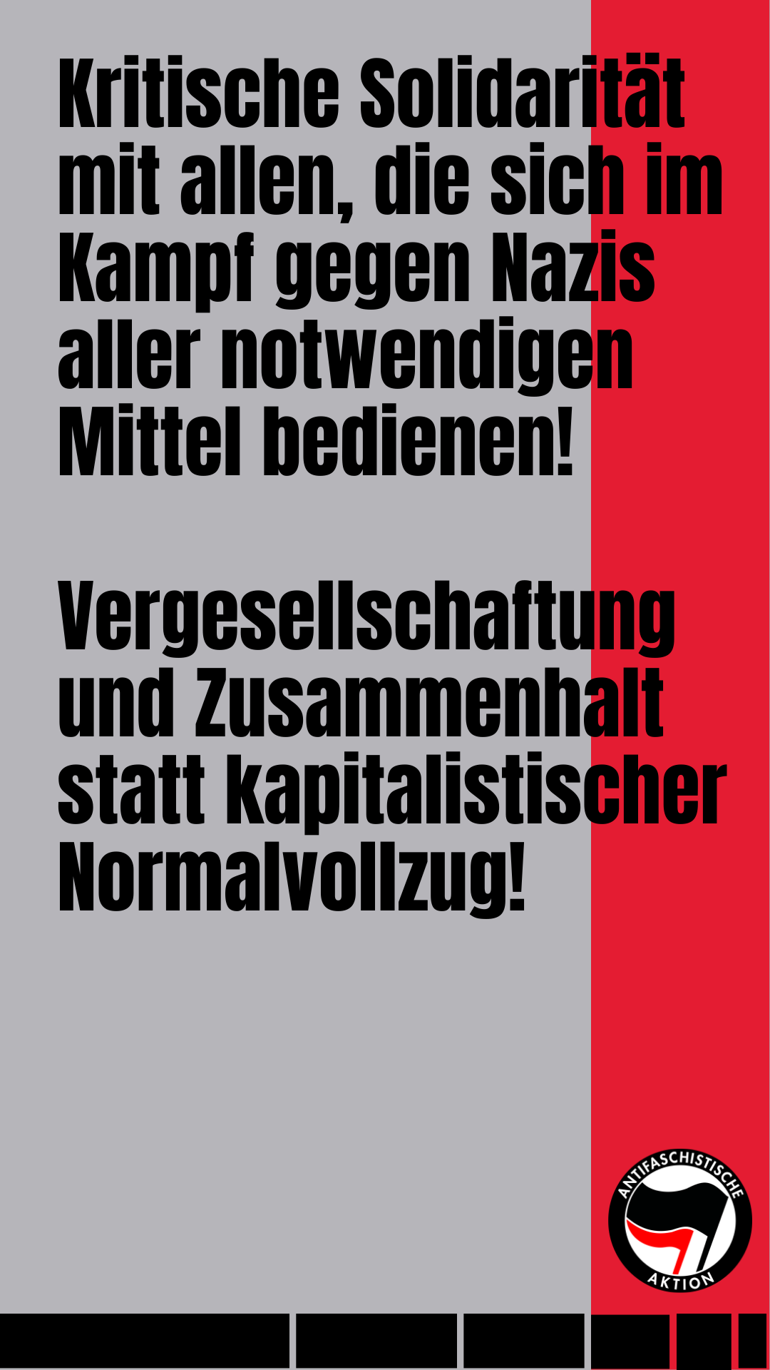 • kritische Solidarität mit allen, die sich im Kampf gegen Nazis aller notwendigen Mittel bedienen.